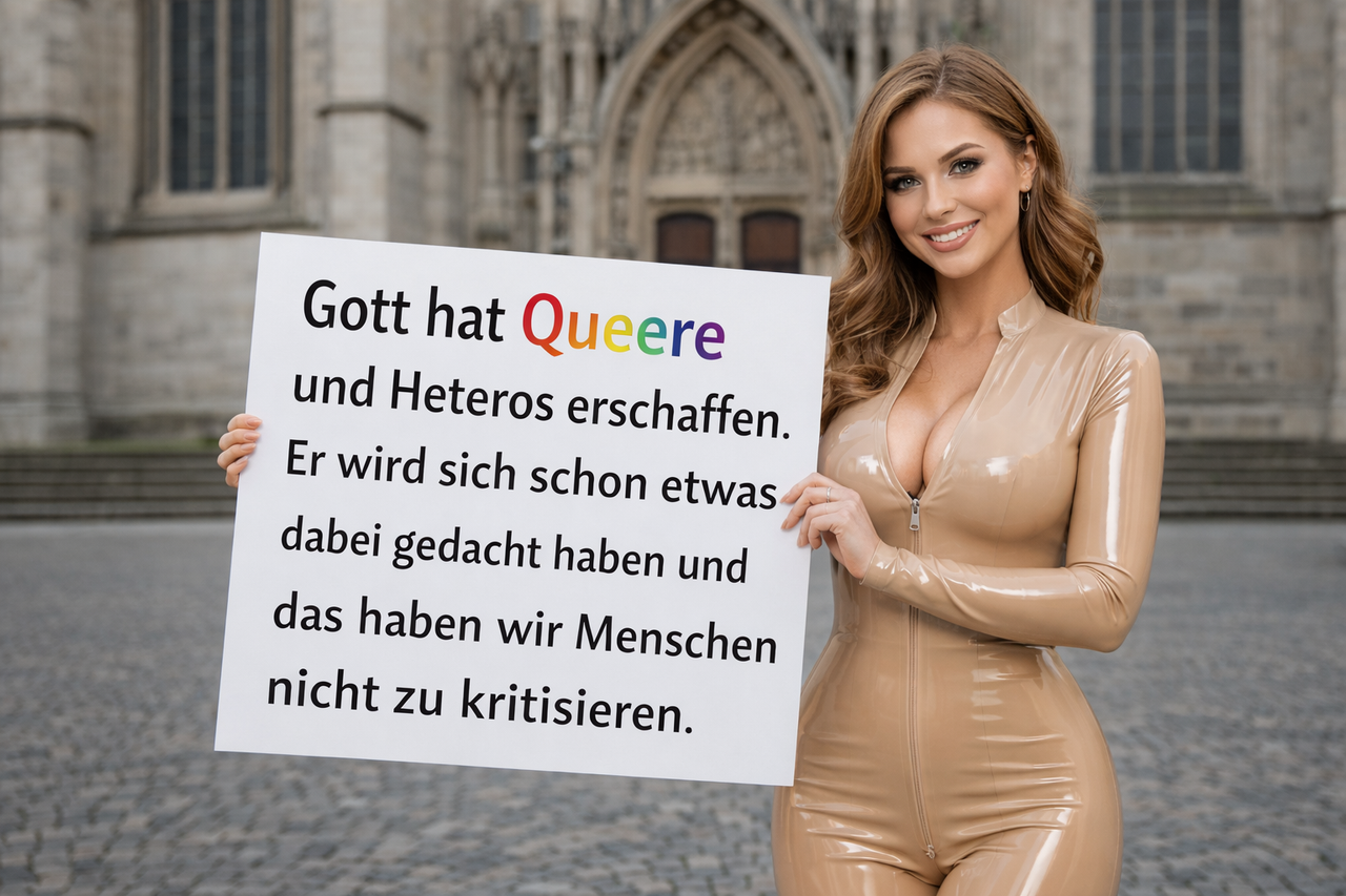 „Nee, eher ‚GEFÄHRLICHER GLANZ: ÖRR zeigt Latex! Wie sicher sind unsere Kinder?‘ – oder die Boulevardblätter: ‚LESBISCHER LATEX-SCHOCK‘. Verstehen Sie, wir leben in Zeiten der Medienempörung… man findet Gründe, wenn man welche sucht.“