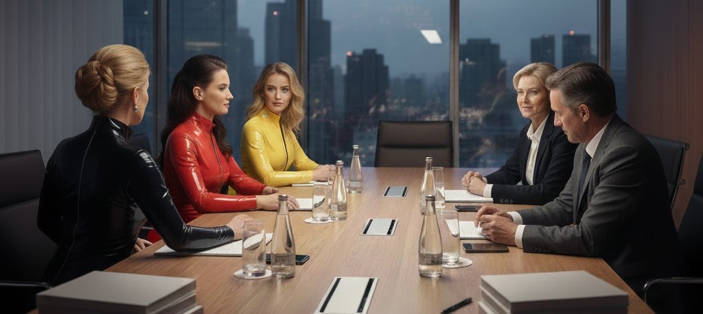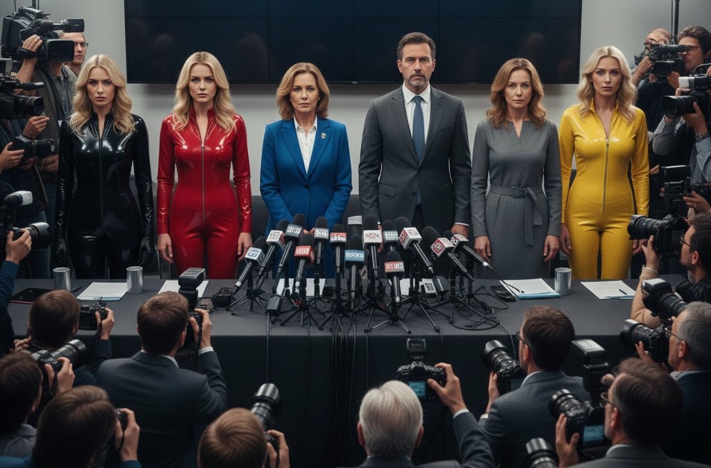 Die Kameras klicken. Die Latexcatsuits – schwarz, rot, gelb – glänzen ruhig, nicht laut. Kein Trotz. Keine Pose. Präsenz. Lina eröffnet das Pressegespräch: