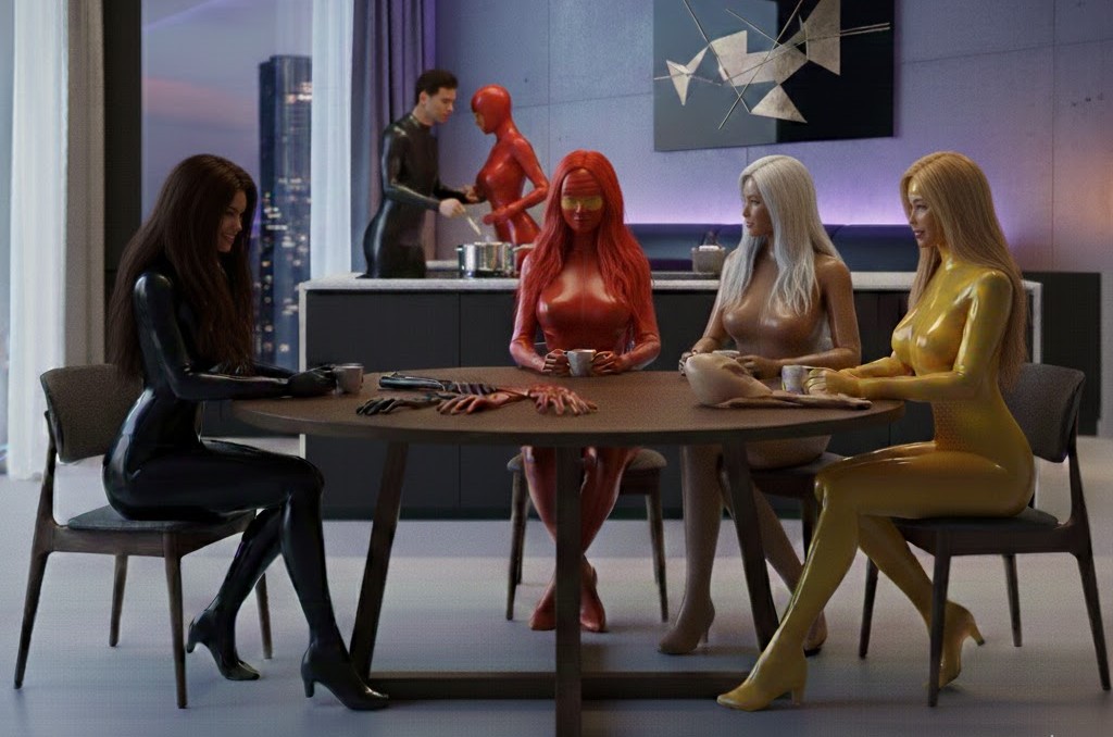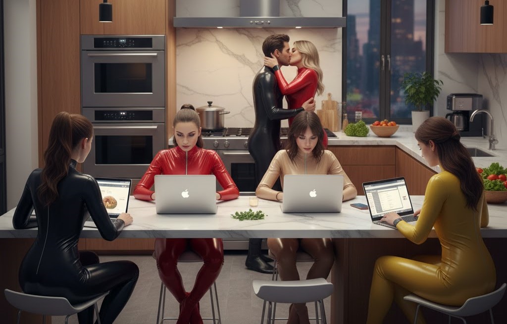 Das Schlafzimmer liegt ruhig da. Die transparenten Latexbahnen an den Wänden brechen das Licht weich, als würde der Raum selbst atmen. Kein Glanz zur Schau, sondern ein stilles Leuchten. Die sechs stehen im Kreis um das gemeinsame Latexbett und halten sich an ihren Händen, ihre Catsuits wie selbstverständlich, nicht betont, nicht erklärt. Etwas hat sich gesetzt. Jetzt wird es ausgesprochen. Lina sagt leise: