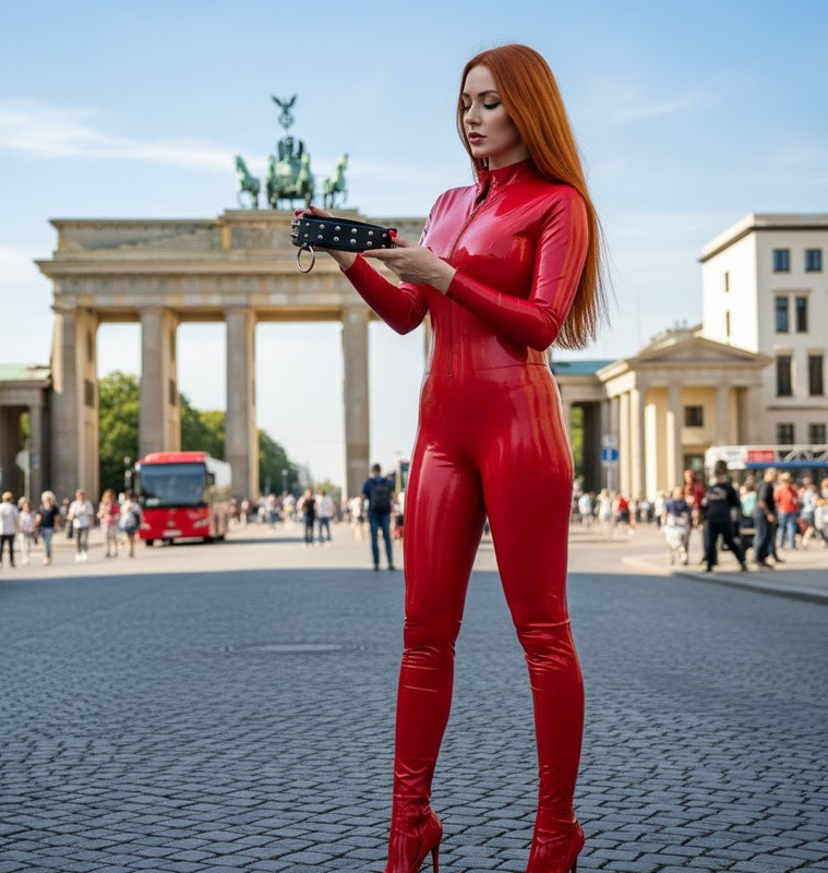Die Straßen Berlins atmen den frühen Abend ein, als die Fünf das Atelier verlassen. Ihre Latexcatsuits fangen das goldene Licht ein, jeder Schritt ein leises, vertrautes Rascheln, das sie inzwischen wie eine gemeinsame Sprache verstehen. Noch hängen die neuen schwarzen Latexhalsbänder – fein gearbeitet, weich, warm im Griff – sorgfältig verpackt in einer glänzenden Tüte zwischen ihnen. Keiner trägt sie schon. Und doch spüren alle denselben leisen Strom der Vorfreude.
