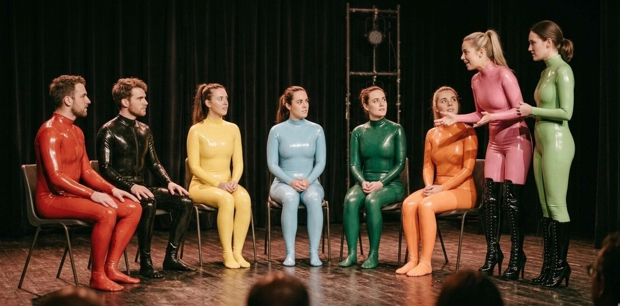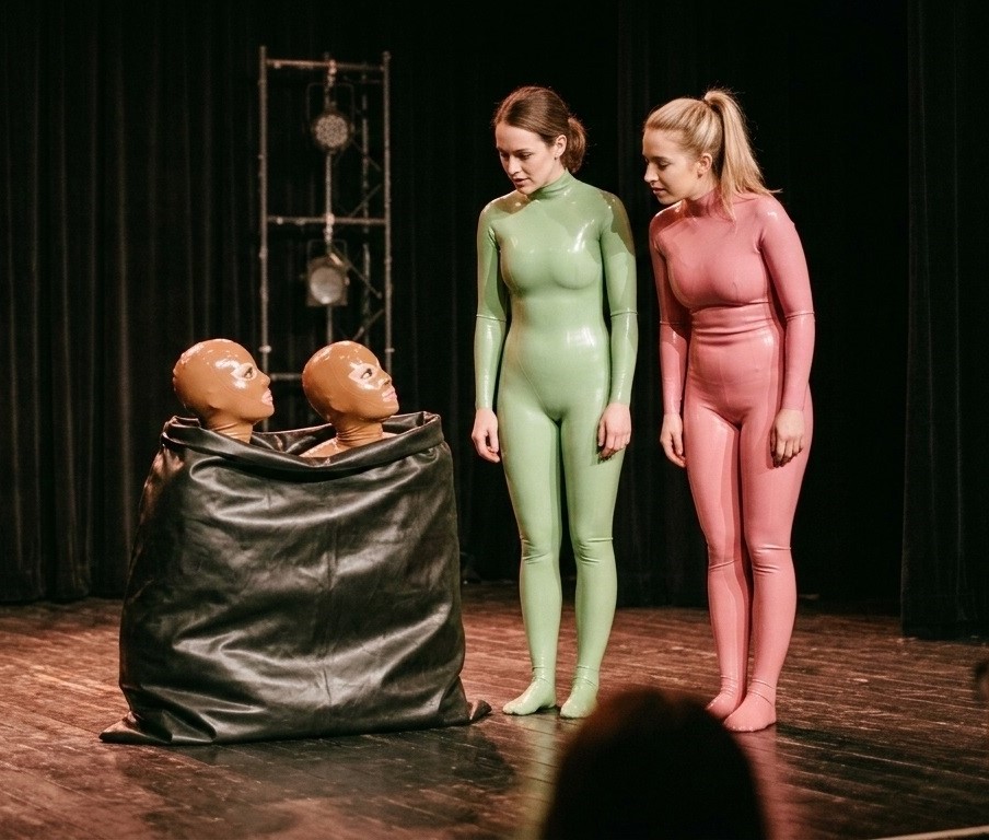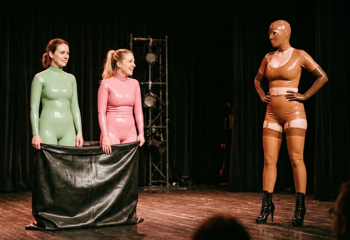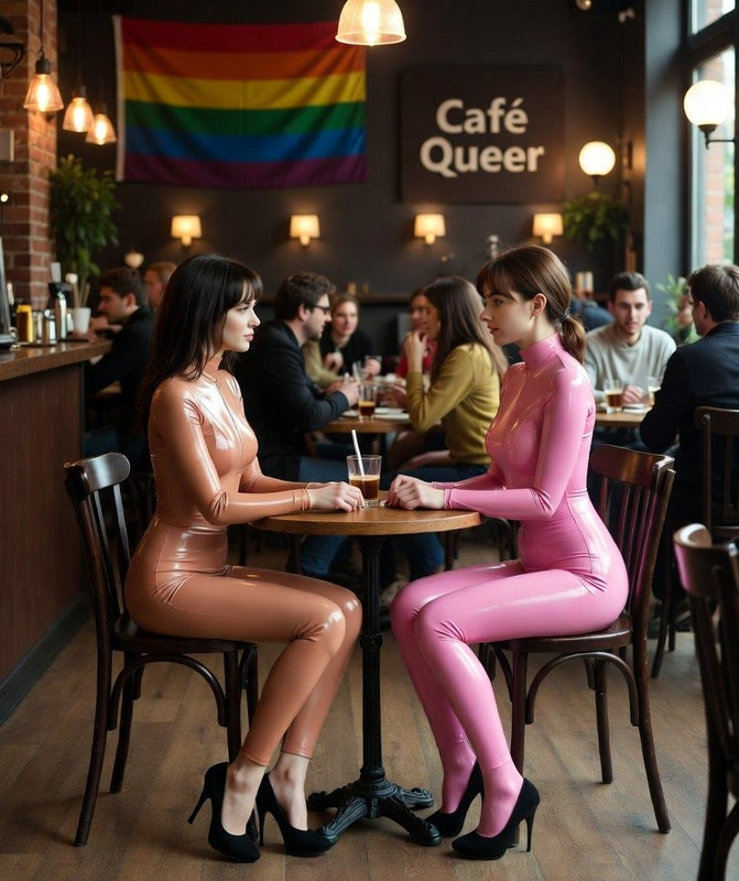 Bella und Amina gehen ins Kino – nebeneinander im Dunkeln, ihre Latexcatsuits schimmern im fahlen Licht der Leinwand. Wenn sich ihre Knie berühren, bleibt diesmal die Berührung. Sie sitzen im Theater, die Hände zunächst getrennt auf den Armlehnen. Nach der Pause liegen ihre Finger ineinander, als wäre es selbstverständlich. Sie besuchen das Gummi- und Latexmuseum, lesen gemeinsam die Tafeln über Materialgeschichte, über Handwerk, über kulturelle Bedeutungen. Sie diskutieren, lachen, staunen. Latex ist da, aber es steht nicht mehr zwischen ihnen.