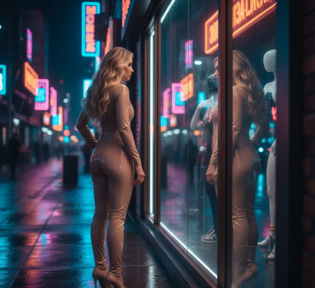 Die Menschen drehen sich nach ihnen um — wie immer. Manche verstohlenen Blicke. Manche neugierig. Manche bewundernd. Manche irritiert. Doch heute erreichen diese Blicke sie nicht mehr so wie früher. Sie landen an ihrem Latex, aber sie dringen nicht durch zu ihrem Herzen.