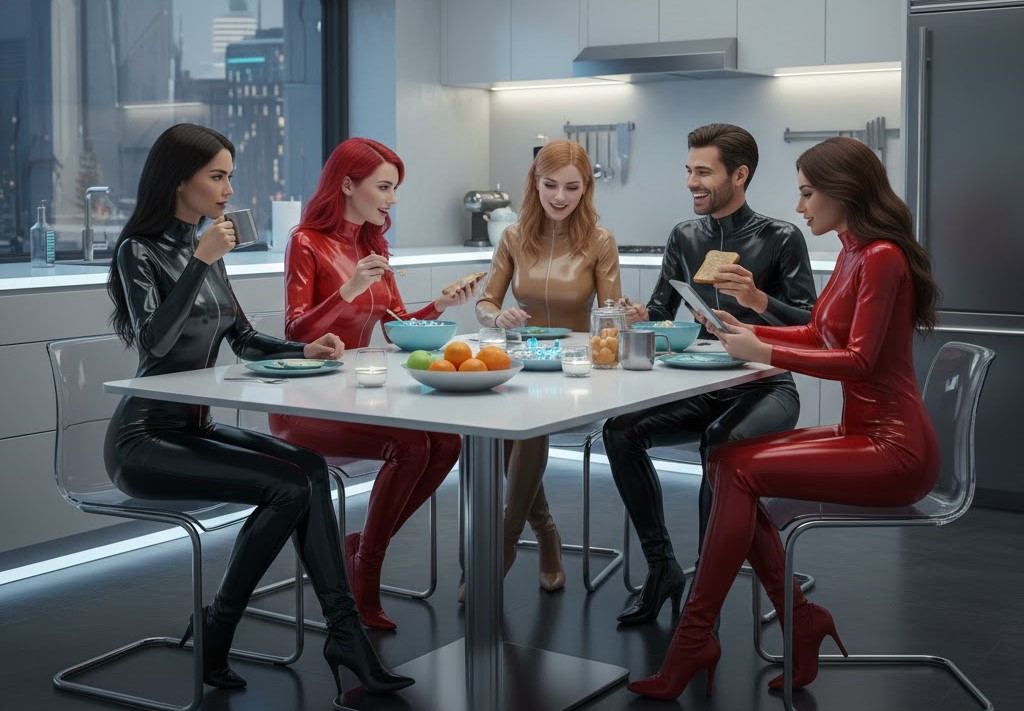 Am Ende des Frühstücks lehnen sich alle fünf zurück. Der Raum ist von einem goldenen Morgenlicht erfüllt, das sich in weichen Reflexen über ihre glänzenden Körper zieht. Und gleichzeitig ist da dieses andere Licht — das innere, stille, unzerstörbare — ein Leuchten, das so hell ist wie der Glanz ihrer Latexcatsuits. Ein Leuchten, das ihnen zuflüstert: