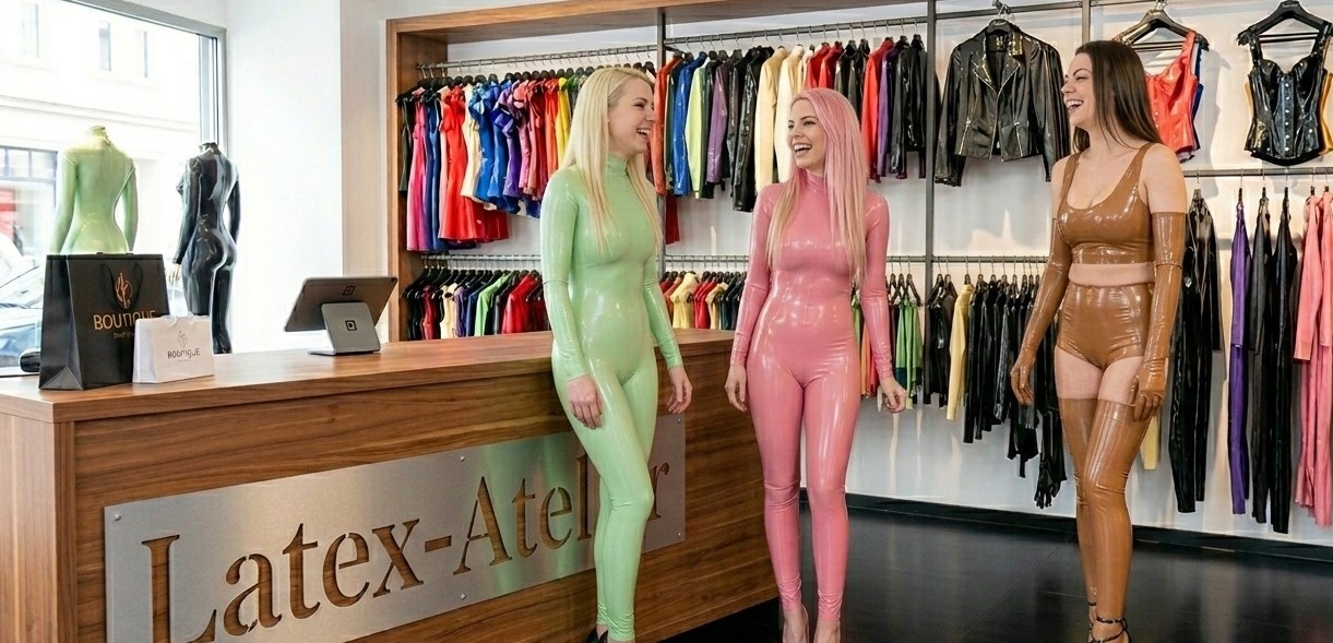 Der Nachmittag ist mild. Bella und Amina stehen Hand in Hand vor dem Latex-Atelier. Im Schaufenster glänzen Catsuits, Masken, Kleider, Korsagen – Formen, die sie beide kennen, beide lieben. Pink neben Hellbraun, High Heels auf dem Gehweg, ihre Finger verschränkt. Sie betrachten die Auslage, aber eigentlich betrachten sie sich selbst darin – gespiegelt im Glas.