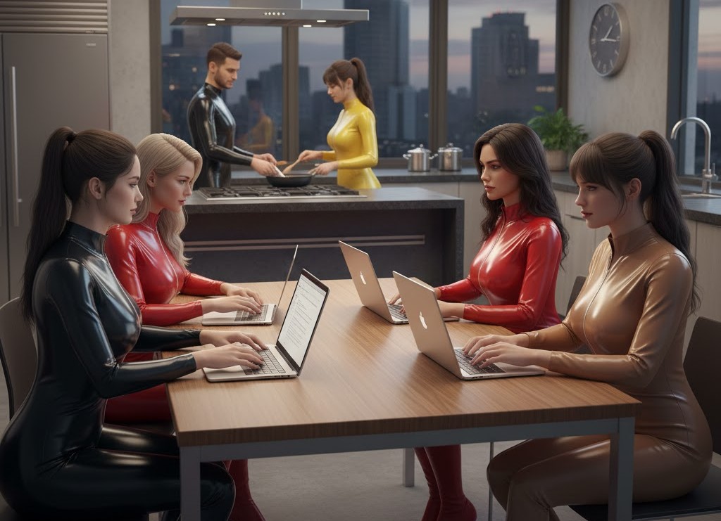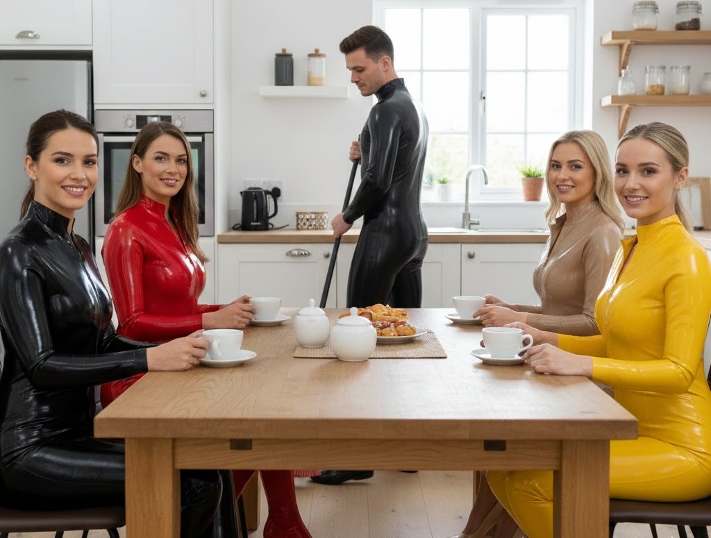 Am Frühstückstisch liegt eine besondere Stille. Nicht leer, sondern dicht. Die fünf – inzwischen sechs – sitzen einander gegenüber, ihre Latexcatsuits frisch gereinigt, wieder angezogen, vertraut eng an Körper und Seele. Der Latexglanz fängt das Morgenlicht ein, als würde er etwas von der Nacht bewahren. Aus dem Schlafzimmer herüber sind sie sichtbar:
