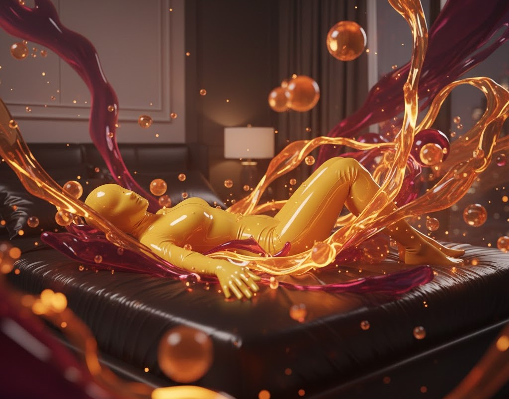 Sie legen sich gemeinsam ins Latexbett. Das Material gibt nach, empfängt sie wie mit zärtlichen Armen. Latex berührt Latex – nicht fordernd, sondern bestätigend. Hände finden Hände, latexbedeckte Finger verschränken sich. Arme liegen an Armen, Köpfe an Köpfen. Nähe ohne Erklärung. Anwesenheit ohne Worte. In dieser Stille geschieht etwas Einfaches und Großes zugleich. Niemand muss sich zeigen. Niemand muss sich behaupten. Sie sind da – miteinander. Die Masken nehmen nichts, sie schenken Tiefe. Die Handschuhe trennen nicht, sie verbinden. Das Bett hält sie, das Latex umhüllt sie, und in dieser Umhüllung entsteht Gewissheit. Sie spüren es alle, noch bevor der Schlaf sie findet: