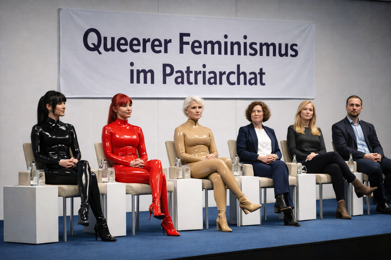 Der Saal des Kongresszentrums ist voll. „Queerer Feminismus im Patriarchat“ steht groß über der Bühne. Sechs Stühle, fünf davon besetzt. Lina in Schwarz, Maya in Rot, Amina in Hellbraun. Die schwarzen Latexhalsbänder fangen das Licht, ohne es zu suchen. Sie sitzen aufrecht. Wach. Unmissverständlich da.
