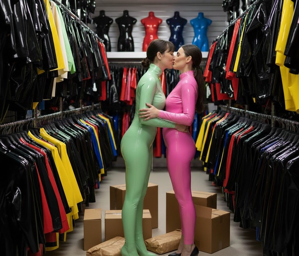 Der süße, leicht vanilleartige Latexduft hängt noch in der Luft, als Bella einen Verkauf abschließt. Die Frau und der Mann bedanken sich, lachen ein wenig aufgeregt, während sie die beiden roten Latexcatsuits, den schwarzen Doppel-Konkon und die beiden Latexmasken vorsichtig verpackt entgegennehmen. Als die Tür hinter ihnen zufällt, ist das Atelier für einen Moment ganz still, nur das leise Knarzen des Bodens und das sanfte Rascheln von Latex zwischen den Regalen.