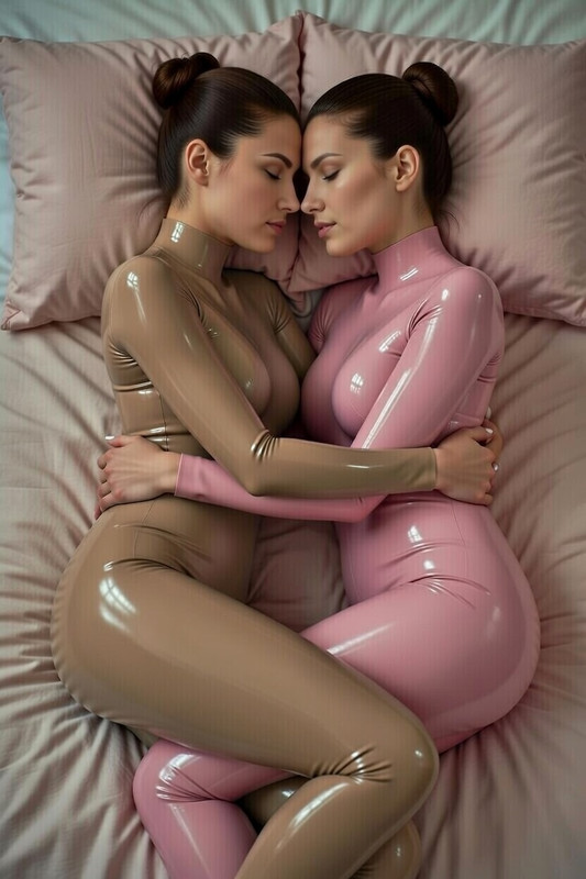 Aus diesem Gespräch heraus entsteht der Wunsch, etwas zu erforschen, nicht aus Neugier im technischen Sinn, sondern aus Vertrauen. Bella und Amina legen sich eng umschlungen auf das Bett, beide noch in ihren hellbraunen und pinken Latexcatsuits und lassen den Tag los. Sie schließen die Augen, atmen ruhig und richten ihre Aufmerksamkeit nicht aufeinander als Personen, sondern auf das Latex auf ihrer Haut und auf das Latex am Körper der anderen. Mit der Zeit entsteht ein seltsames Gefühl von Kontinuität, als würden die Grenzen zwischen ihren Latexcatsuits weicher werden. Körperlich fühlt es sich an, als lägen sie nicht nebeneinander, sondern gemeinsam in einem einzigen, größeren Catsuit, der beide umhüllt.