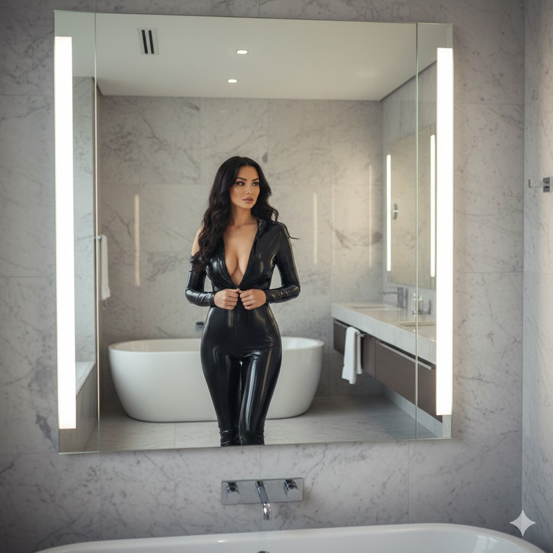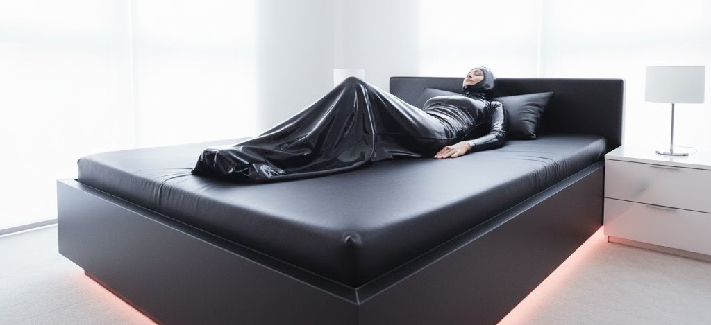 Das erste Licht des Tages fällt sanft durch die Gardinen. Amina liegt noch eingehüllt im schwarzen Latexkokon, der sich wie eine zweite Haut um ihren Catsuit schmiegt. Alles ist still. Alles ist warm. Sie atmet tief ein. Der Geruch von Latex, vertraut und beruhigend, steigt ihr in die Nase. Jedes Einatmen fühlt sich wie ein Ankommen an.