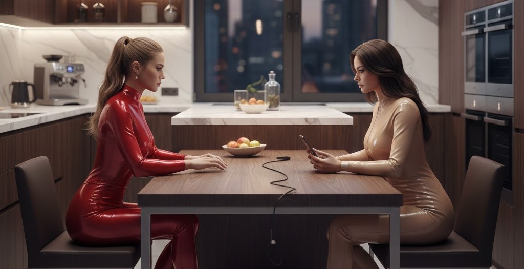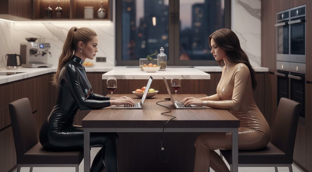 Der Morgen ist stiller als sonst. Das Licht fällt weich durch die Fenster, spiegelt sich matt im Glanz ihrer Latexcatsuits. Der Tisch ist gedeckt, der Kaffee dampft, doch das Gespräch braucht einen Moment, um zu beginnen. Lina beobachtet Amina schon eine Weile. Nicht auffällig.