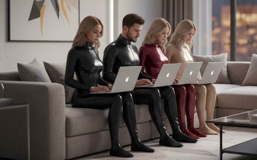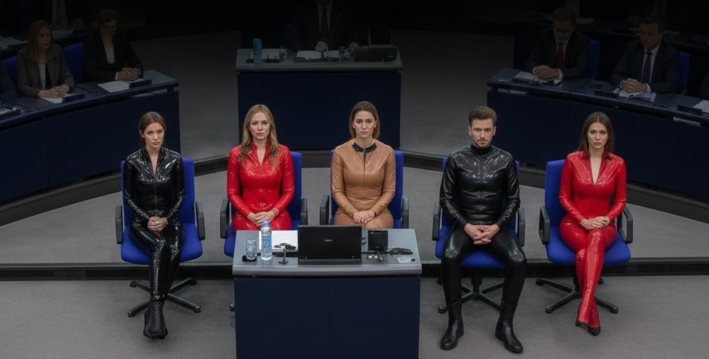 Zuhause breiten sie den Bodybag auf dem Latexbett aus. Schwarz auf Schwarz. Glanz auf Glanz. Latex auf Latex. Wie eine Vertiefung im Licht. Amina trägt bereits ihren hellbraunen Latexcatsuit. Der vertraute Sitz. Die bekannte Umarmung des Materials auf ihrer Haut. Sie atmet einmal tief ein, dann noch einmal. Die anderen vier – Lina, Maya, Lea und Thomas – sitzen auf dem Bett, ebenfalls in ihren Latexcatsuits. Nicht als Zuschauer. Sondern als Zeugen.