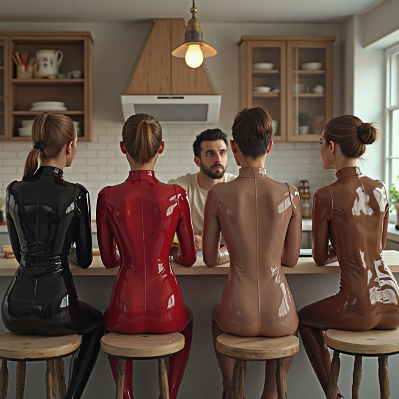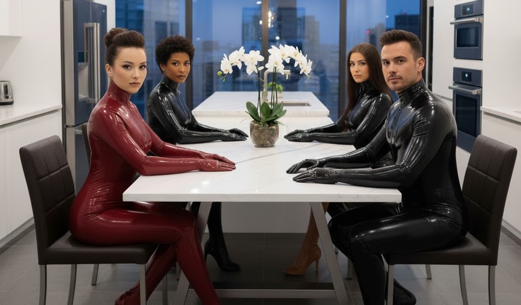 Das Licht fällt weich durch die Fenster. Die fünf sitzen am Frühstückstisch, jeder in seinem Latexcatsuit und Latexhandschuhen, die Halsbänder glänzen im Morgenlicht. Der Duft von frischem Kaffee mischt sich mit dem leichten Latexgeruch, der den Raum erfüllt.